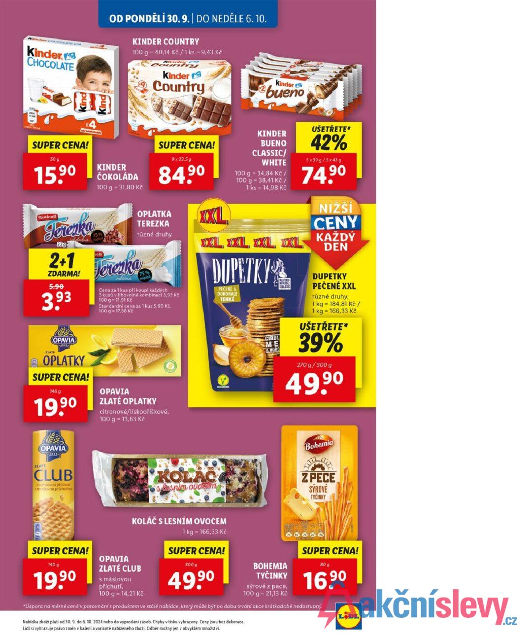 Kinder CHOCOLATE Kinder. CHOCOLATE 12.3 296 ki 7 OD PONDĚLÍ 30.9. | DO NEDĚLE 6. 10. KINDER COUNTRY 100 g = 40,14 Kč / 1 ks = 9,43 Kč Kinder Country Kinder bueno 23407SR x4 SUPER CENA! 50 g 15.90 Tastino Ferenka 33g 2+1 KINDER ČOKOLÁDA 100 g = 31,80 Kč 75% aboladons náplně ZDARMA! 5.90 3.93 SUPER CENA! 9 x 23,5 g 84.90 OPLATKA TEREZKA různé druhy Perenka náplně Cena za 1 kus při koupi každých 3 kusů v libovolné kombinaci 3,93 Kč. 100 g 11,91 Kč Standardní cena za 1 kus 5,90 Kč. 100 g 17,88 Kč ZLATÉ OPAVIA OPLATKY SUPER CENA! 146 g 19,90 OPAVIA ZLATÉ OPLATKY citronové/lískooříškové, 100 g 13,63 Kč XXL KINDER BUENO CLASSIC/ WHITE 100 g 34,84 Kč / 100 g 38,41 Kč / 1 ks = 14,98 Kč XXL XXL XXL DUPETKY PEČENÉ A DOKONALE TENKÉ MASTER OF INCREDIBLE SNACKS UŠETŘETE* 42% 5x39 g/5x43 g 74.90 NIŽŠÍ CENY KAŽDÝ DEN CIBUL ME A HORC DUPETKY PEČENÉ XXL různé druhy, 1 kg 184,81 Kč / 1 kg = 166,33 Kč UŠETŘETE* 39% 270 g/300 g 49.9⁰ OPAVIA Bohemia ZLATÉ CLUB Smáslovou příchuti smoslovou príchutou KOLÁC o's besnim ovocem Z PECE SÝROVÉ TYČINKY SUPER CENA! 140 g 19,90 KOLÁČ S LESNÍM OVOCEM OPAVIA ZLATÉ CLUB s máslovou příchutí, 100 g 14,21 Kč 1 kg = 166,33 Kč SUPER CENA! 300 g 49,90 BOHEMIA TYČINKY sýrové z pece, 100 g = 21,13 Kč SUPER CENA! 80 g 16,90 *Úspora na měrné ceně v porovnání s produktem ve stálé nabídce, který může být po dobu trvání akce krátkodobě nedostupný. Nabídka zboží platí od 30. 9. do 6. 10. 2024 nebo do vyprodání zásob. Chyby v tisku vyhrazeny. Ceny jsou bez dekorace. Lidl si vyhrazuje právo změn v balení a variantě nabízeného zboží. Odběr možný jen v obvyklém množství. LIDL